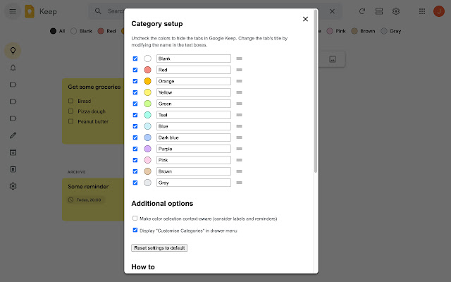 您可以通过在 google keep 中打开菜单来访问设置,然后点击“自定义类别”