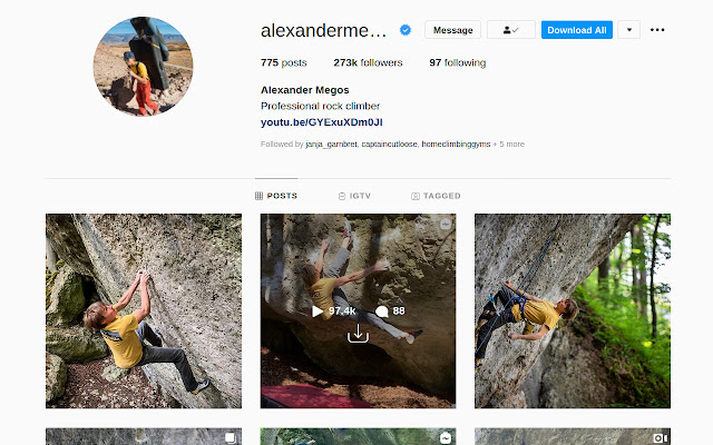 如果您已经单击了图像,则可以使用书签图标旁边的按钮进行下载。批量帐户下载的下载按钮位于关注按钮旁边。请注意不要一次下载太多图片,因为 Instagram 可能会因为下载次数过多(大约五分钟)而暂时阻止您。
